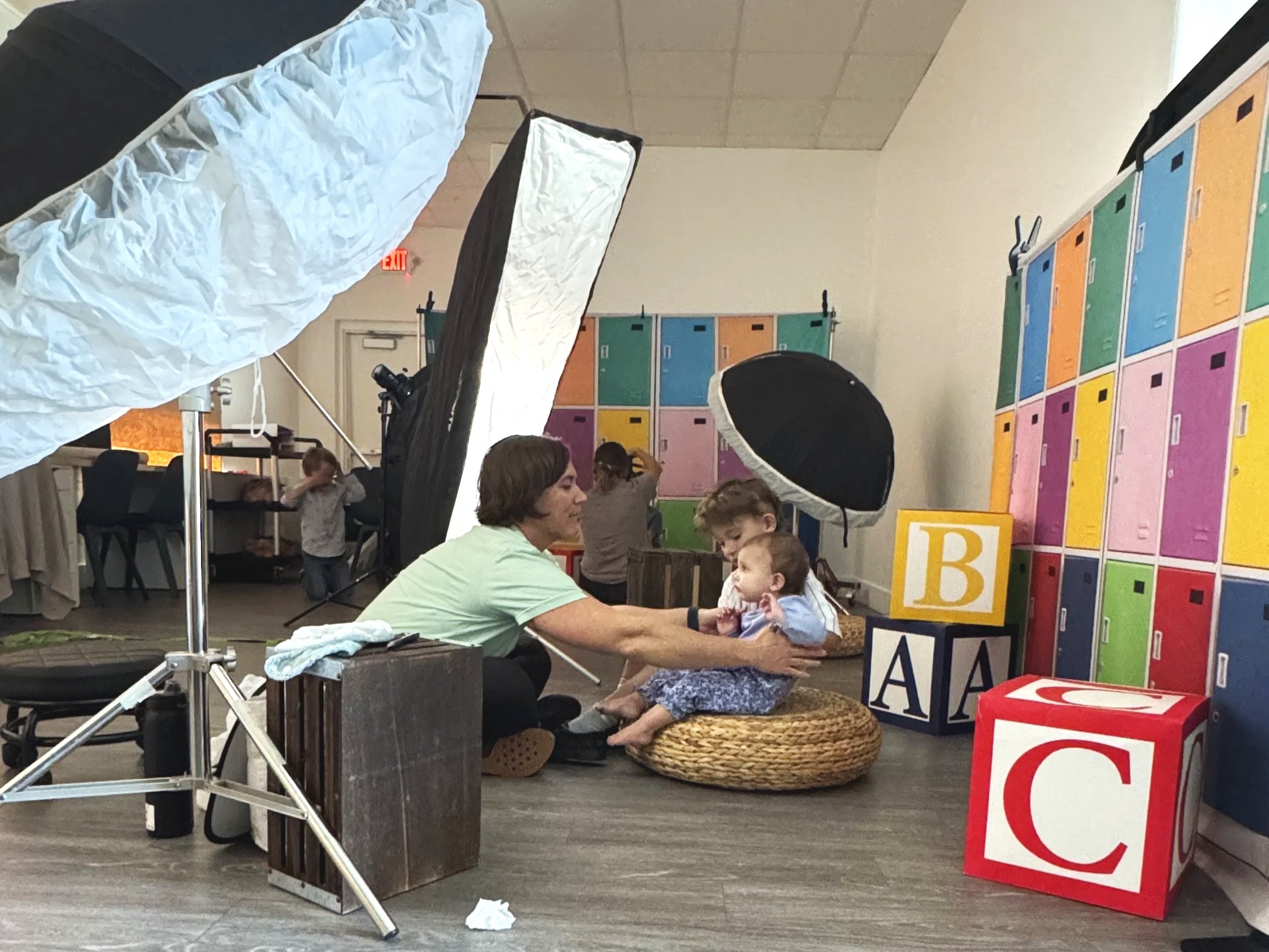 Our photo rooms are set up to feel calm and welcoming. We use soft lighting, simple backdrops, and a consistent setup to help kids feel secure. Too many people or voices in the room can create overstimulation, especially for our youngest students.